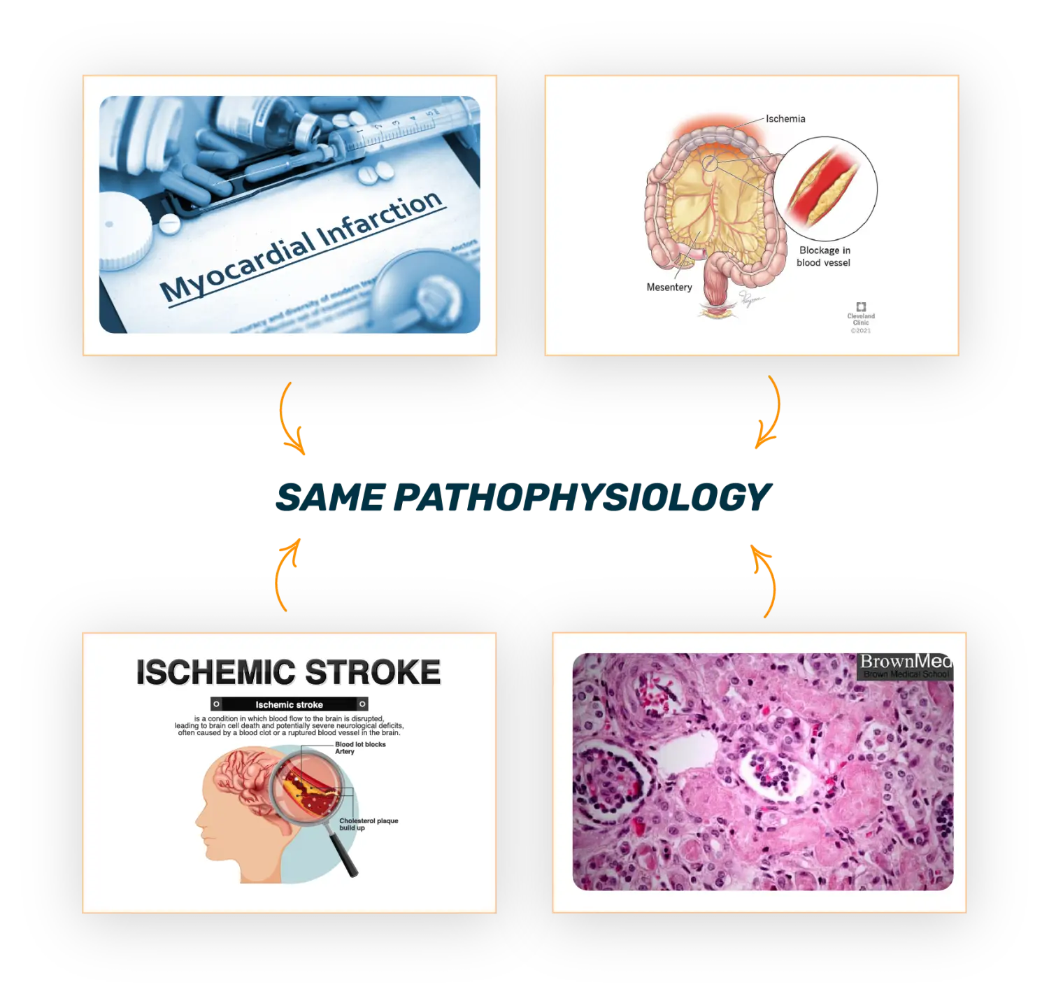 For example, you’ll recognize that myocardial infarction, ischemic stroke, acute tubular necrosis, and acute mesenteric ischemia share the same pathophysiology but are called different names depending on which organ is affected.